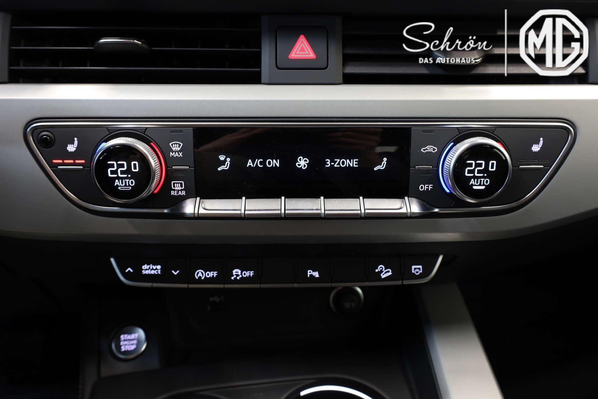 • Komfort: 3-Zonen-Komfortklimaautomatik, Anschlussgarantie 3 Jahre max. 100.000 km, Audi drive select, Audi pre sense city, Audi pre sense rear und basic, Außenspiegel elektr. verstell-, heiz- und anklappbar, mit Abblendautomatik, Außenspiegel elektrisch einstell-, beheiz- und anklappbar, beidseitig automatisch abblendend, mit Memory-Funktion, Einparkhilfe hinten (APS), Einparkhilfe plus, Elektromechanische Parkbremse, Fahrer-Informations-System (FIS) mit Farbdisplay, Fernlichtassistent, Gepäckraumklappe elektrisch öffnend und schließend, Geschwindigkeitsbegrenzungsanlage, Kamerabasierte Verkehrszeichenerkennung, Komfortschlüssel mit sensorgesteuerter Heckklappenentriegelung, Komfortschlüssel ohne Safelock, Multifunktionskamera, Rückfahrkamera, Sitze vorn elektr. verstellbar (links mit Memory), Sitzheizung vorn, Sonnenblenden vorn, Sonnenschutzverglasung abgedunkelt, Spurwechselwarnung, Vorbereitung für Functions on Demand, Vordersitze elektrisch einstellbar mit Memory-Funktion für den Fahrersitz