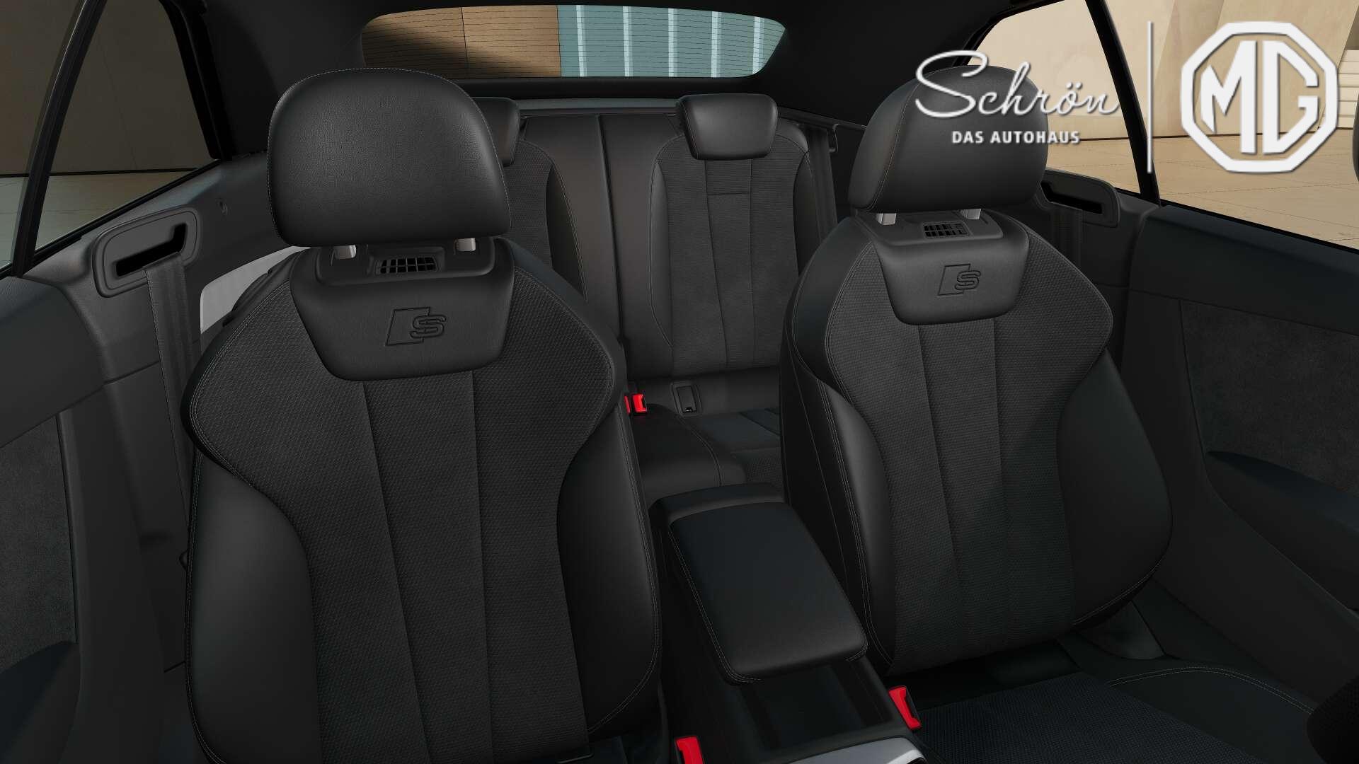 • Interieur: 4-Wege-Lendenwirbelstütze für die Vordersitze, Akzentflächen schwarz glänzend, Ambiente-Lichtpaket, Audi virtual cockpit plus, Dachhimmel in Stoff in spezifischer Farbe, Dekoreinlagen Aluminium matt gebürstet, Einstiegsleisten mit Aluminiumeinlegern vorn, beleuchtet, S-Schriftzug, Fußmatten vorn und hinten, Innenspiegel automatisch abblendend, rahmenlos, Komfortmittelarmlehne vorn, Lederlenkrad 3-Speichen mit Multifunktion plus, Mikrofaser Dinamica Frequenz/ Leder-Kombination mit S-Prägung, Pedalerie und Fußstütze in Edelstahl, Rücksitzlehne, umklappbar, Sportsitze vorn, Start-Stop-Knopf, USB-Ladeschnittstellen im Fond