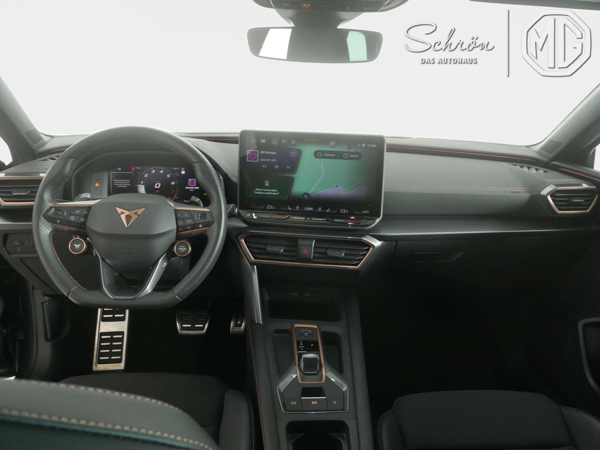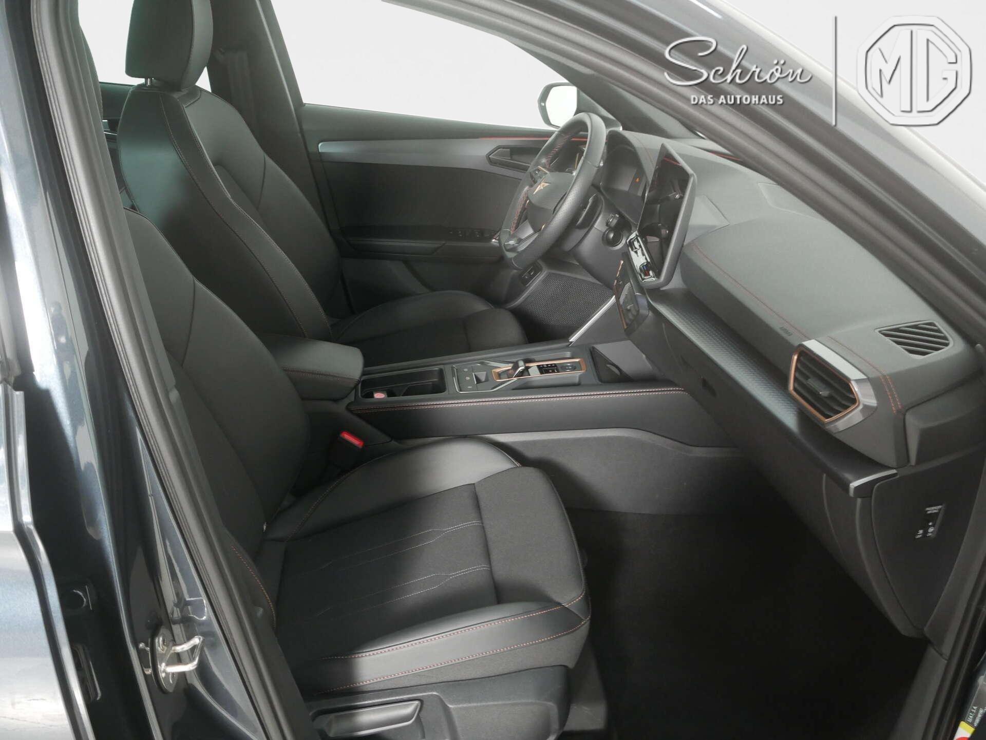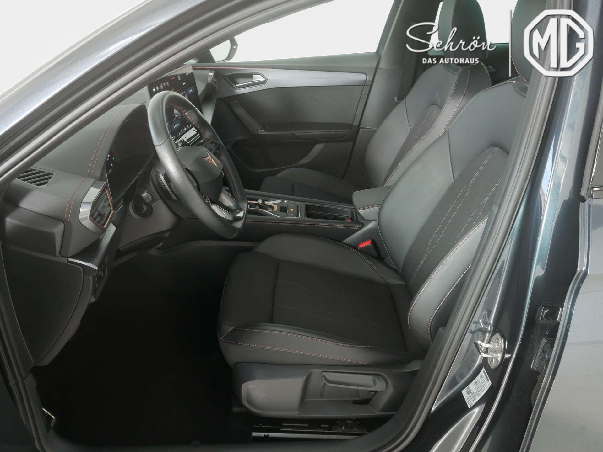 • Interieur: 2 Leseleuchten vorn,2 hinten, 2 USB-C-Schnittstellen vorn, 230V Wechselrichter und Steckdose für Europa, Connectivity Box inkl. Wireless Charger, CUPRA Supersportmultifunktionslenkrad, beheizbar mit CUPRA Mode Selector, Dekor-Einlagen für Konsole, Einstiegleisten in den Türausschnitten (beleuchtet), Gepäckraumabdeckung,schiebbar, Gepäcktaschen an Rückenlehnen, Höheneinstellung,manuell,für Vordersitze, Lautsprecher, vorn und hinten, Lendenwirbelstütze, manuell einstellbarin Vordersitzlehnen, Media System Plus mit 12,9" Display, Mittelarmlehne vorn, Netztrennwand, Rücksitzbank ungeteilt, Lehne geteilt umlegbar mit Mittelarmlehne, Rücksitzlehnen umklappbar mit Fernentriegelung im Kofferraum, Sicherheitsgurte vorn höhenverstellbar, Sicherheitsinnenspiegel automatisch abblendbar, Sitzbezug / Polsterung: Stoff/Kunstleder schwarz (Sharp Textil), Smart Ambient Light, Sonnenblenden mit Spiegel, beleuchtet, mit Airbag-Label auf Sonnenblende und B-Säule, Sportpedalerie in Aluminiumoptik, Variables Ladebodenkonzept, Virtual Cockpit