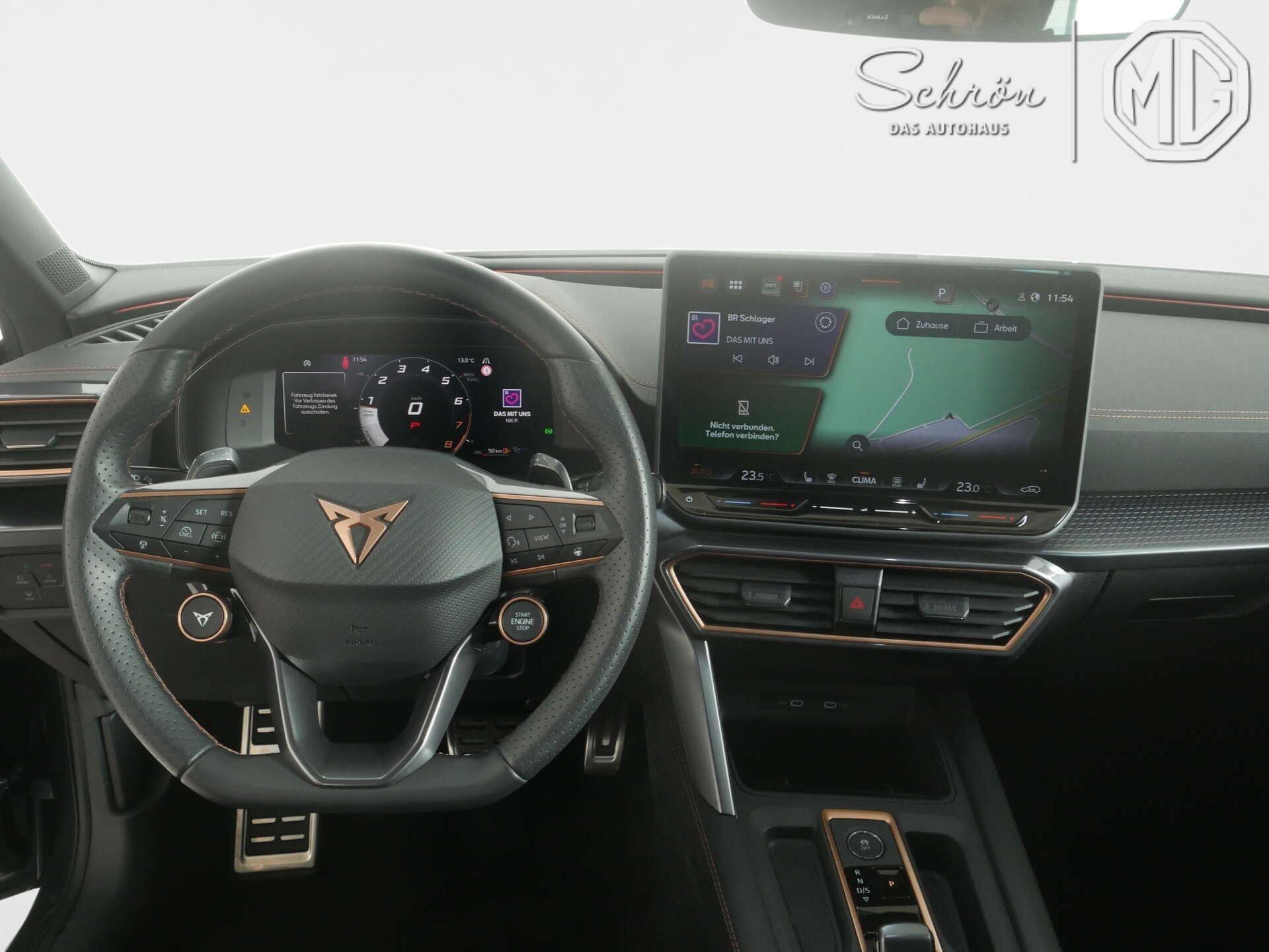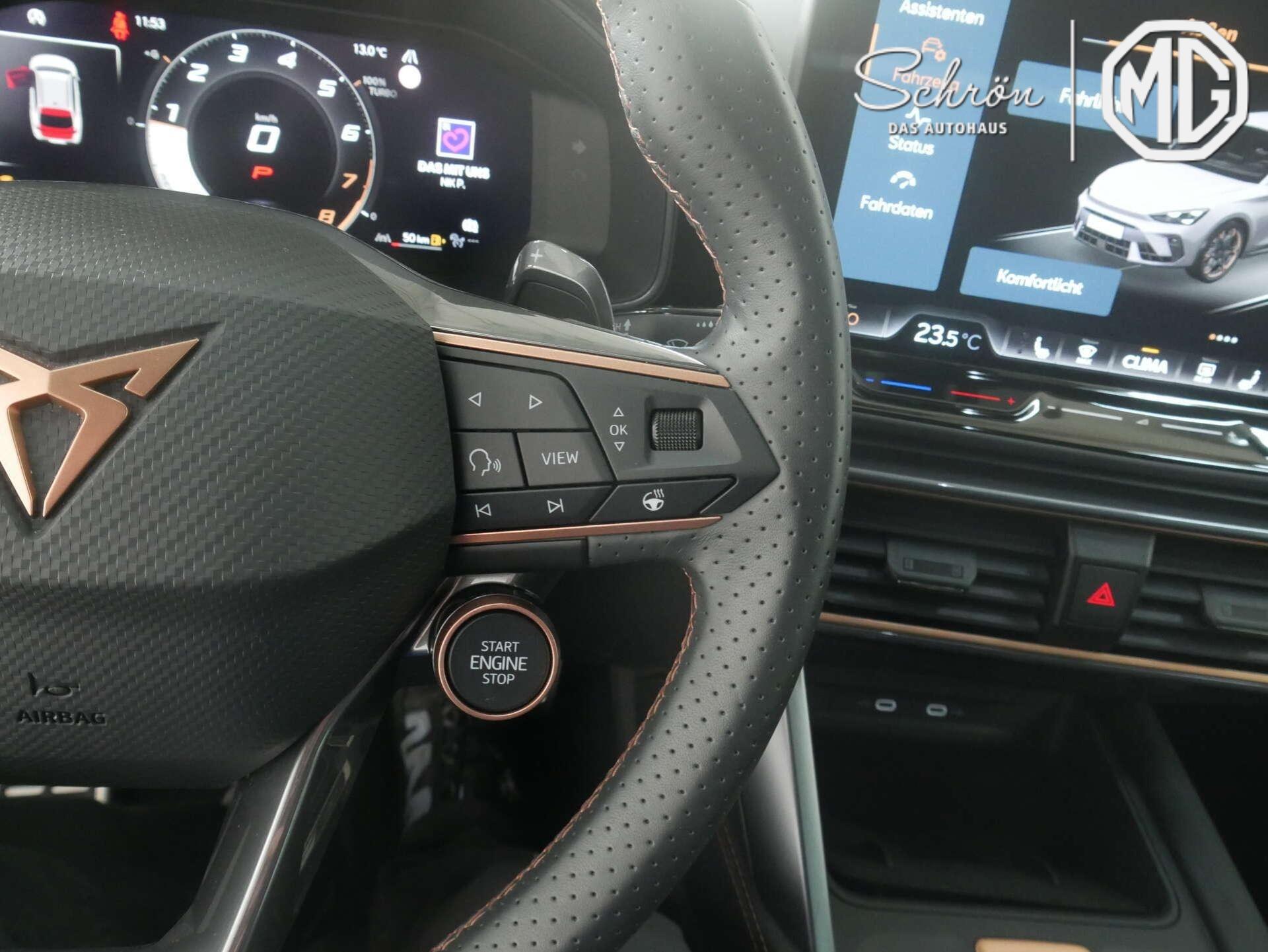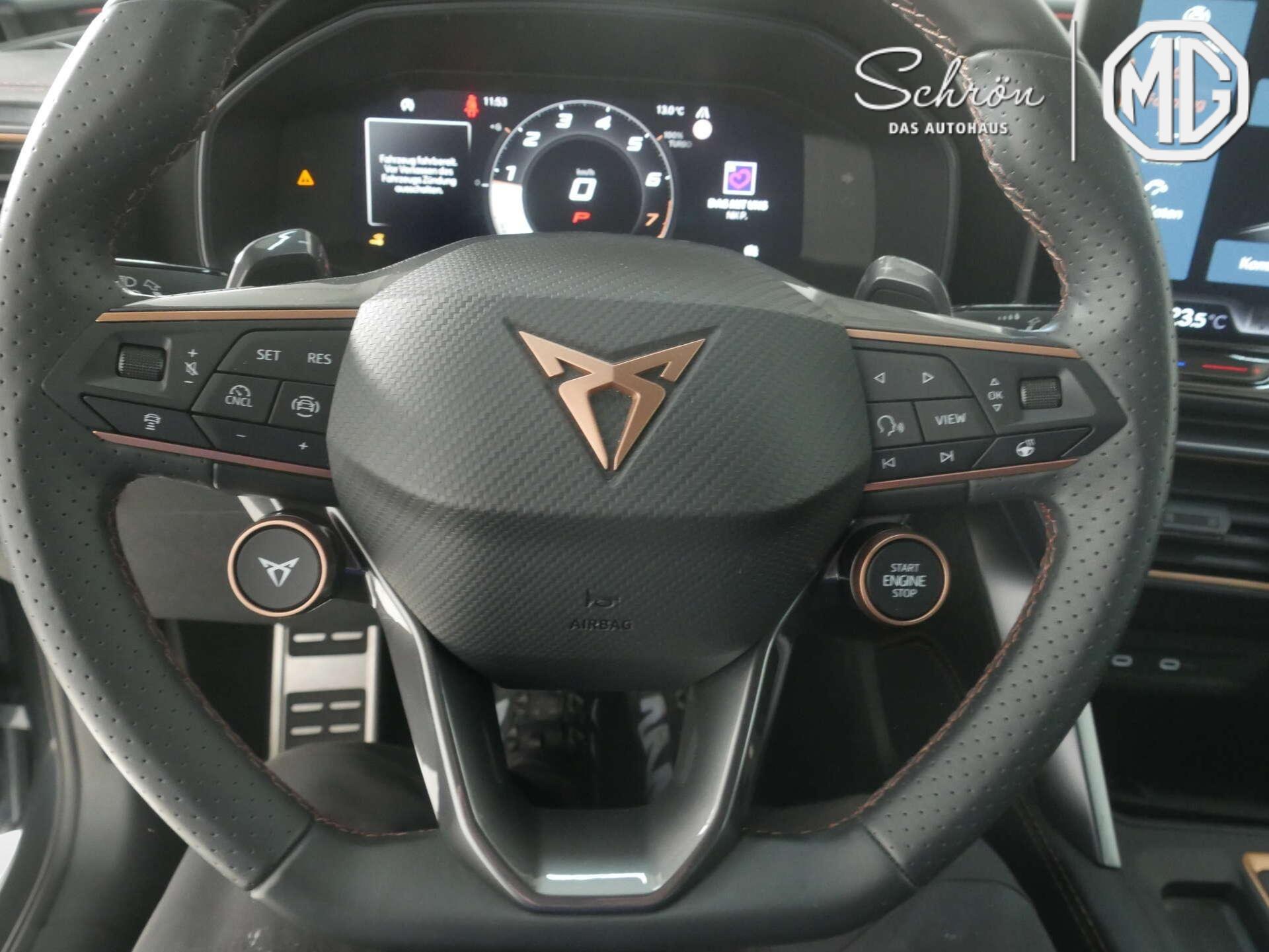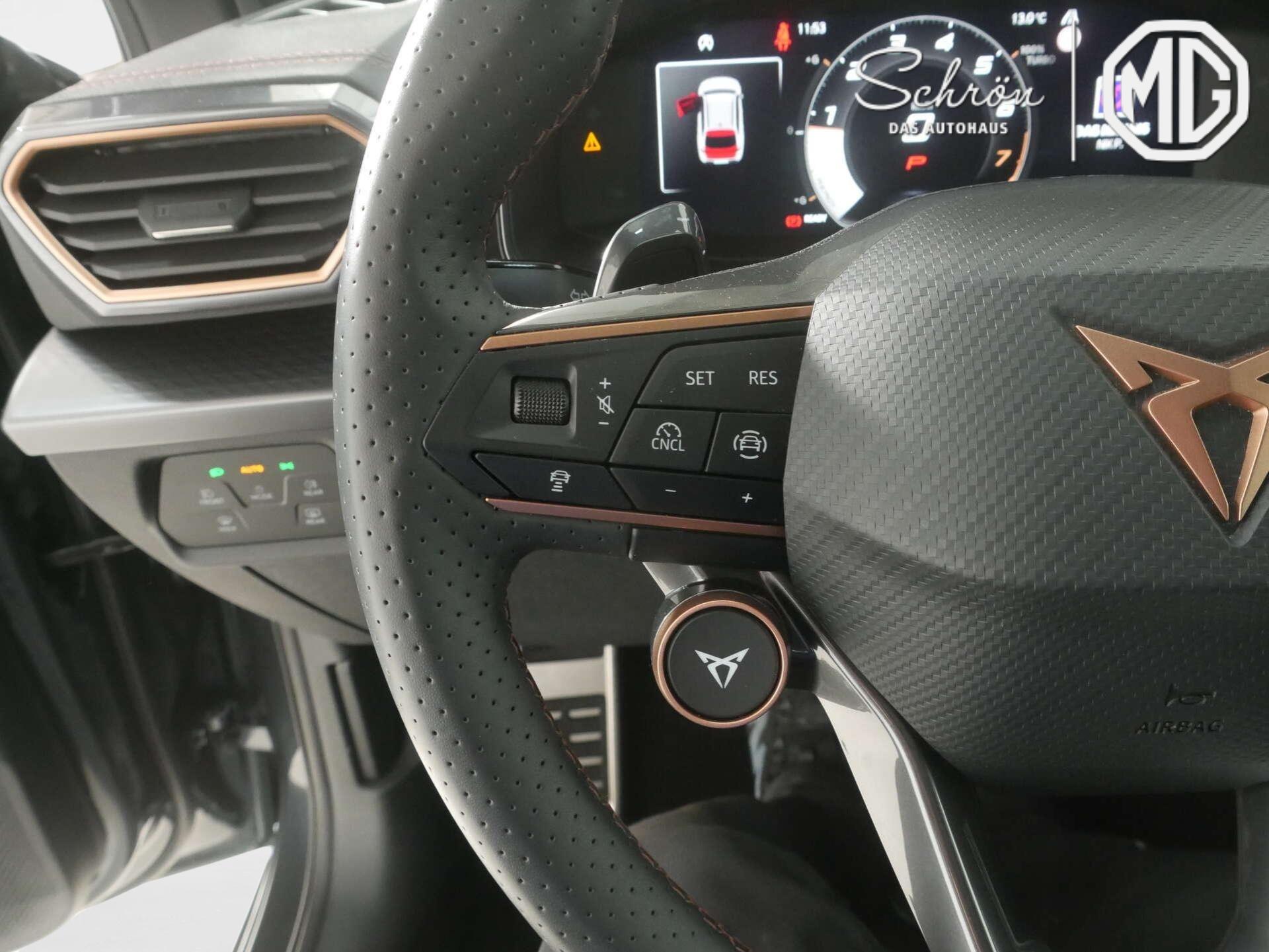 • Interieur: 2 Leseleuchten vorn,2 hinten, 2 USB-C-Schnittstellen vorn, 230V Wechselrichter und Steckdose für Europa, Connectivity Box inkl. Wireless Charger, CUPRA Supersportmultifunktionslenkrad, beheizbar mit CUPRA Mode Selector, Dekor-Einlagen für Konsole, Einstiegleisten in den Türausschnitten (beleuchtet), Gepäckraumabdeckung,schiebbar, Gepäcktaschen an Rückenlehnen, Höheneinstellung,manuell,für Vordersitze, Lautsprecher, vorn und hinten, Lendenwirbelstütze, manuell einstellbarin Vordersitzlehnen, Media System Plus mit 12,9" Display, Mittelarmlehne vorn, Netztrennwand, Rücksitzbank ungeteilt, Lehne geteilt umlegbar mit Mittelarmlehne, Rücksitzlehnen umklappbar mit Fernentriegelung im Kofferraum, Sicherheitsgurte vorn höhenverstellbar, Sicherheitsinnenspiegel automatisch abblendbar, Sitzbezug / Polsterung: Stoff/Kunstleder schwarz (Sharp Textil), Smart Ambient Light, Sonnenblenden mit Spiegel, beleuchtet, mit Airbag-Label auf Sonnenblende und B-Säule, Sportpedalerie in Aluminiumoptik, Variables Ladebodenkonzept, Virtual Cockpit