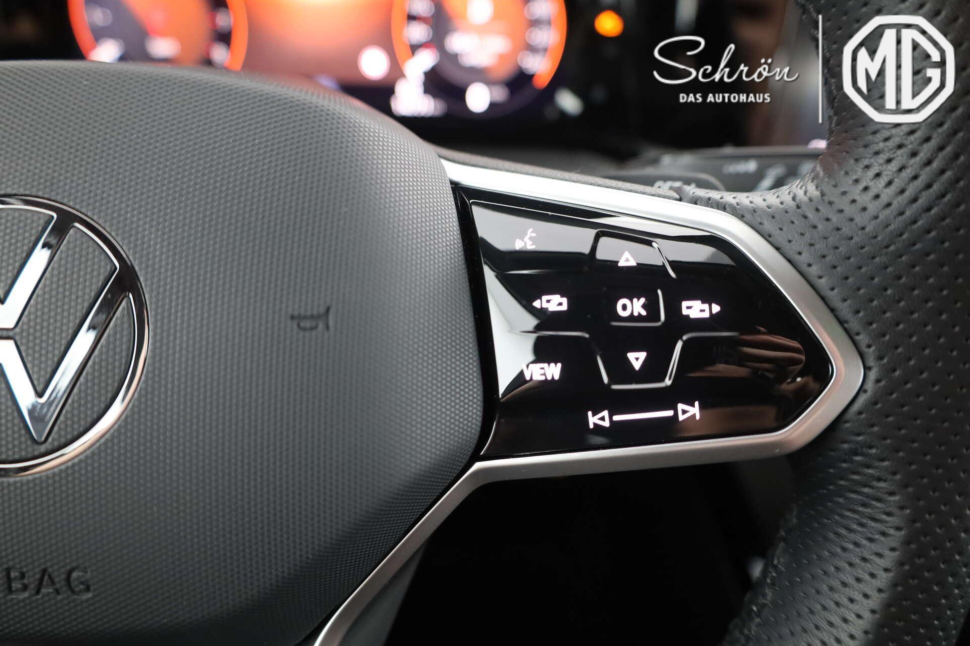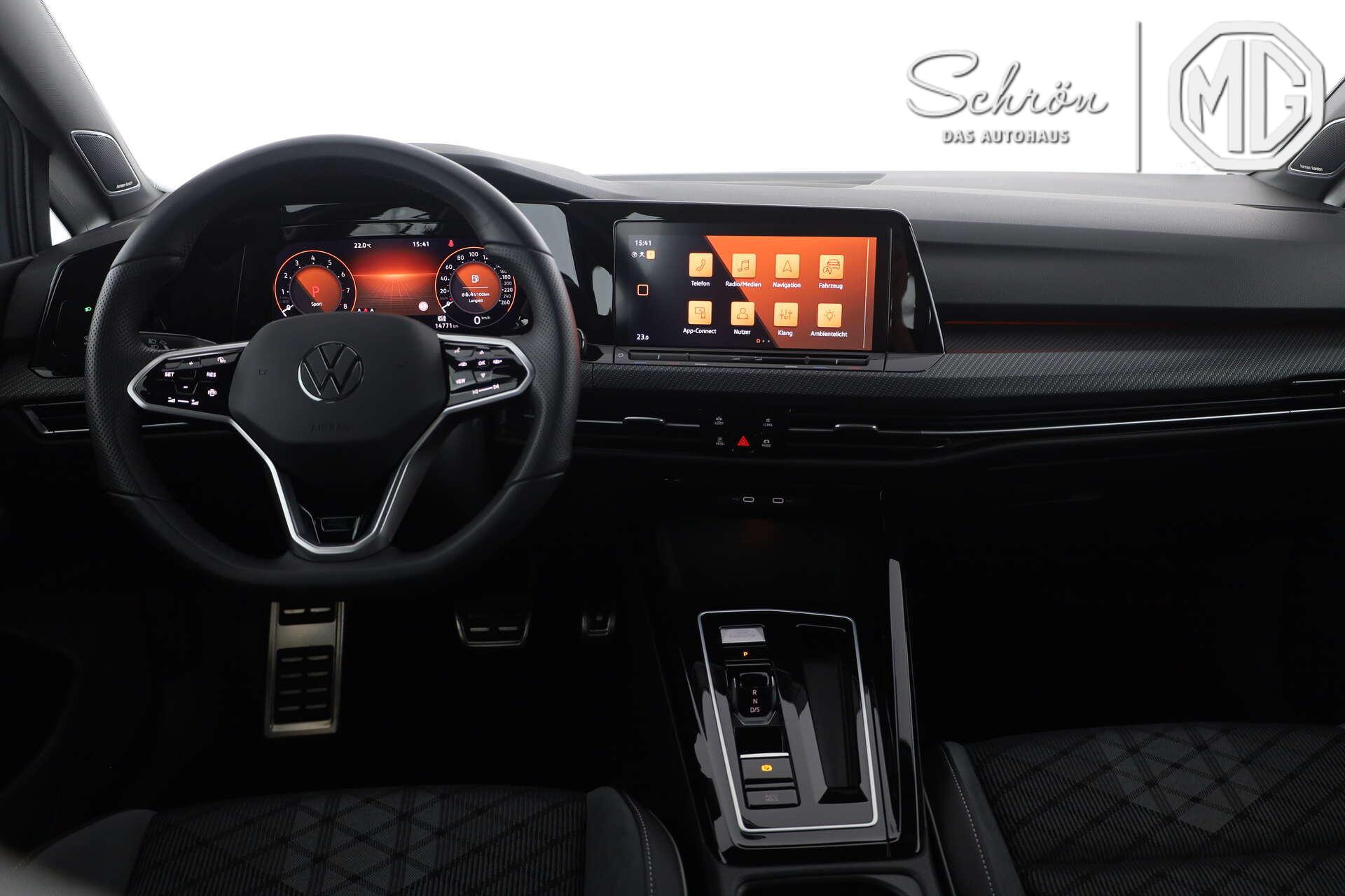 • Interieur: 12-V-Steckdose im Gepäckraum, 2 LED-Leseleuchten vorn und 2 hinten, 2 USB-C-Schnittstellen vorn, 2 USB-C-Ladebuchsen an der Mittelkonsolehinten Ladeleistung bis zu 45 W, 3 Kopfstützen hinten, Ambientebeleuchtung 30-farbig, Chrom-Applikationen an Spiegeleinstell- und Fensterheberschaltern, Chromleisten an den Auströmern, Dekoreinlagen "Carbon Grey" für Instrumententafel und Türverkleidungen vorn, Digital Cockpit Pro, mehrfarbig, verschiedene Info-Profile wählbar, Kopfstützen vorn im Sitz integriert, LED-Leuchte im Fußraum vorn, Lichtfarbewählbar, Lendenwirbelstützen vorn, Make-up-Spiegel beleuchtet in den Sonnenblenden, Mittelarmlehne vorn höhen- und längseinstellbar, Multifunktions-Sportlenkrad in Leder, mit Touch-Bedienung und Schaltwippen, Pedale in Edelstahl gebürstet, Rücksitzbank ungeteilt, Lehne asymmetrisch geteilt umklappbar, mit Mittelarmlehne, Sitzmittelbahnen der Vordersitze und deräußeren Rücksitzplätze in Stoff "R-Line", -innenwangen in "ArtVelours", Top-Sportsitze vorn, Vordersitze mit Höheneinstellung